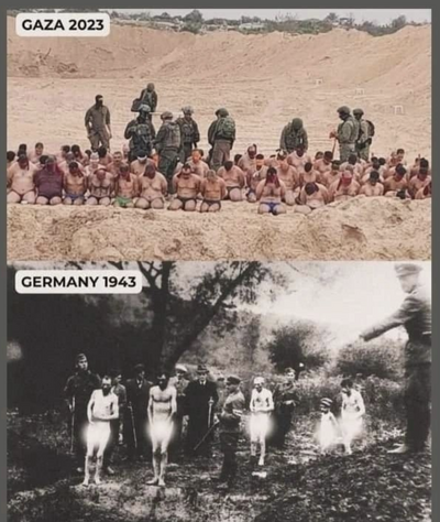 L’image envoyée sur un réseau social représente en haut des hommes palestiniens, en slip, agenouillés dans le sable, entourés de soldats israéliens en armes. Ils ont les bras entravés et les yeux bandés. En dessous, 4 hommes et un enfant, debout, entièrement nus sont au bord d’une fosse, et ils sont entourés de soldats nazis et de civils en armes.