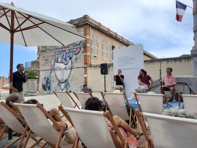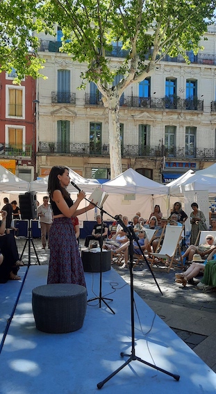 Imaginez-vous tranquillement installés, à l’ombre, sous des parasols ou des voiles tendues entre les murs des ruelles du quartier haut, l’ancien quartier des marins du port de Sète, dans un transat, entendre une voix qui vous parle, à vous, en arabe, en espagnol, en français, en italien, et vous dire de l’intime, de l’absurde, de la colère, de l’amour, de la rage et de la nostalgie…