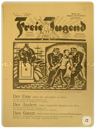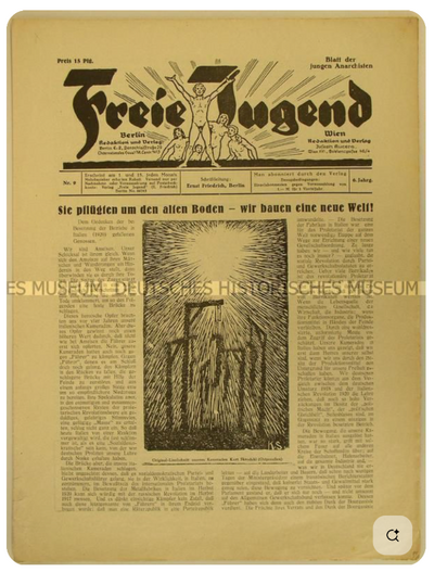 Ainsi, à l’origine, le mouvement anarchiste de jeunesse n’est pas issu de l’une des deux organisations anarchistes et anarcho-syndicalistes pour adultes existant en Allemagne, la FKAD et la FAUD. L’impulsion est venue principalement d’un jeune anarchiste, Ernst Friedrich, qui a quitté la FSJ au milieu de l’année 1919 et a publié son propre journal, Freie Jugend, à Berlin. Friedrich s’est engagé dans la création d’une « Fédération de la jeunesse révolutionnaire de langue allemande ». Dans son journal, il se détournait radicalement des idées de la « Ligue spartakiste » et prônait le « socialisme sans domination », le « rejet de la violence », la « liberté » et « l’amour ». Fin 1919, la « fédération » de Friedrich comptait prétendument 40 groupes locaux.(4)
